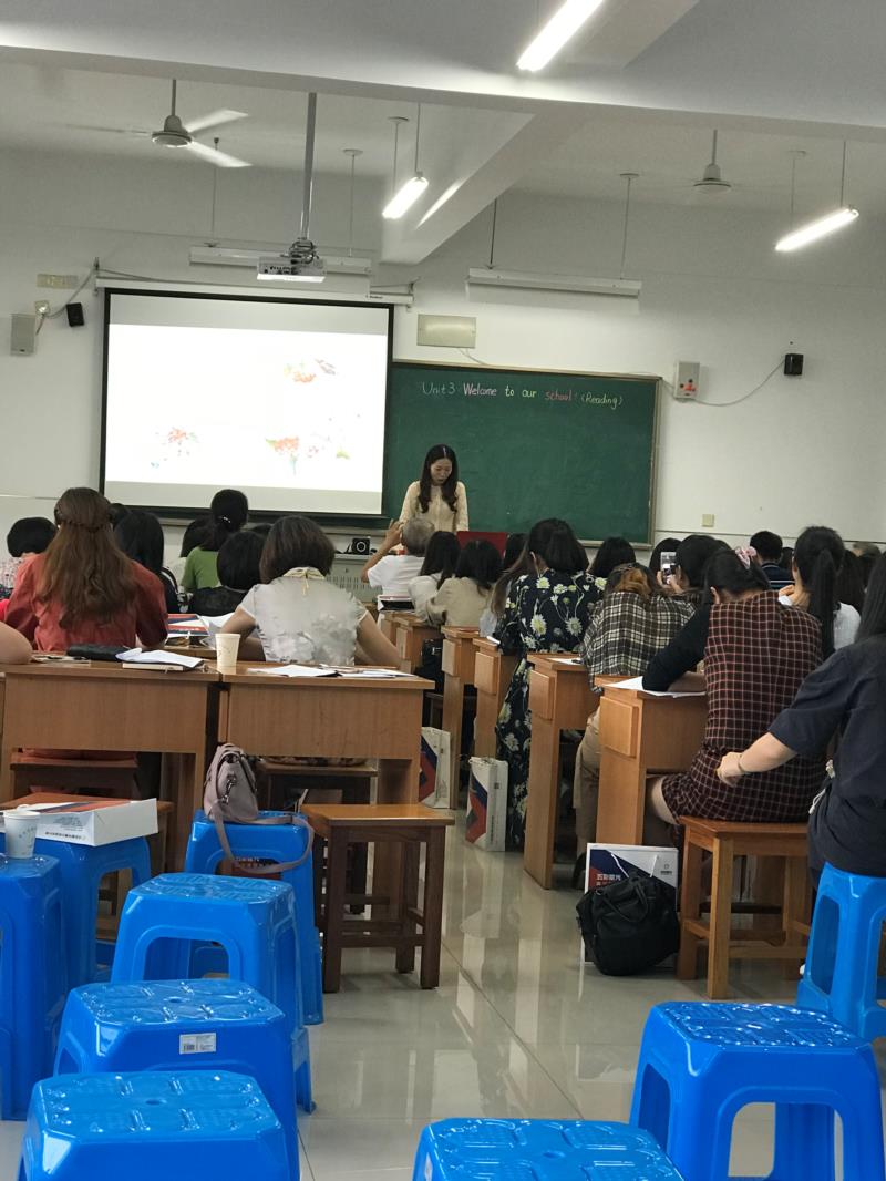 来自飞龙实验小学的的王芳老师和飞龙中学的倪青老师共同执教初一英语 Unit 3 《Welcome to our school》。王老师通过让学生欣赏飞龙实验小学的图片,在自由谈论What’s in our school?中进而引出Millie’s school,在情境预设下,借助图片,逐步形成对话框。学生们紧密联系生活实际,师生互相交流,自由创编对话,实现了所学语言运用的内化和拓展。整堂课,王老师注重培养学生良好的学习习惯,小组合作运用得恰如其分,关注学生语言素养和文化素养的培养,为后续的英语学习做好铺垫。倪青老师也是以观看飞龙中学的学校视频引入新课,创设情景,循序渐进,由浅入深,贴近生活,诱发思维,充分调动了学生的积极性,课堂气氛和谐,学生积极参与,展示了初中英语课的魅力,让学生在初入初中英语之门时,带着乐趣,带着憧憬。