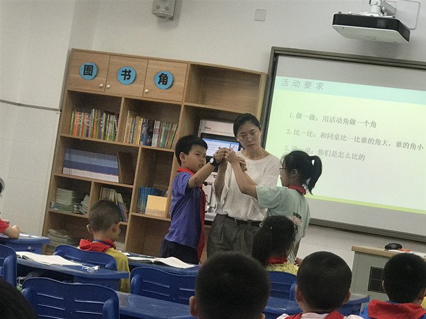 第一节课由秦鑫钰老师执教了一年级下册《笔算两位数加两位数(进位)》。秦老师通过复习旧知、情境导入、学习新知、巩固练习等展开教学。利用“摆一摆”、“拨一拨”等数学操作活动,形象感受两位数加两位数进位加法的算理和算法;第二节课由华晨羽老师执教二年级下册《认识角》。华老师通过摸角、指角、画角、做角、找角等课堂操作活动,加深学生对角的认知。
