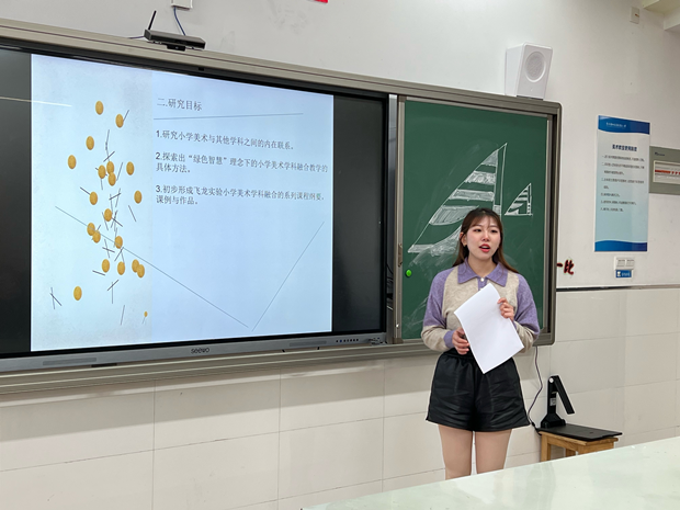 其二,由徐艺、徐叶老师分别围绕美术组申报的课题展开中期汇报。两位青年教师作为课题主持人以PPT课件的形式进行了精彩的汇报,分别从课题开展的主要研究工作、课题的阶段性研究成果、课题研究过程中遇到的问题与困惑、下一步的思路与方向等方面进行了详细地汇报。之后,金波主任对两个课题作出了针对性的点评并提出了可行性建议,高位引领并指导课题走向,用具体课例引导实践,同时提出将学生评价纳入课题的研究中完善美术评价体系。