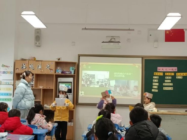 上课前,老师们明学情、选素材、研教案,在教中学。课堂上,孩子们读故事、学知识、悟道理,在学中思。一年级的周彦君老师执教的《和大人一起读》阅读推进课。小朋友们在周老师的指导下由浅入深地掌握了该如何迅速抓住书籍的重要信息,理解书本内容的技能。其次,周老师以学生为主体,教师为主导,循循善诱的教会孩子们多种形式阅读。结合形式多样的阅读方法讲了《金斧头》的故事,通过说一说、演一演、评一评等方式,让孩子们切身代入进了故事的世界。在故事的最后周老师不忘升华故事主题,让学生在阅读的同时明白了“做人要诚实的”的道理。周老师自然流畅的课堂节奏和良好的课堂组织能力给听课老师留下了的深刻的印象。让学生不知不觉的提高了阅读效率,懂得了阅读的好处,可谓是润物细无声!