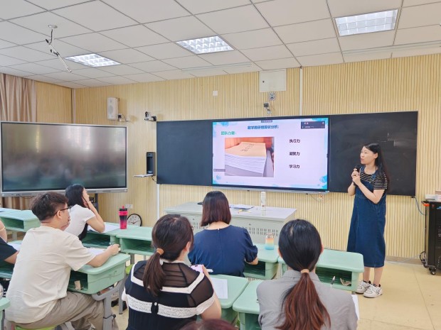活动一开始,王怡雯组长进行了详尽的数学教研组工作计划交流,指出教研组目前的优势在于有项目课题,有教研平台,有骨干力量;劣势则在教研组、备课组活动主题不明晰,教师教科研水平薄弱,五梯队成员较少……基于此,本学期目标定为:“生长式教研,引领方向”,做到每一次教研活动有目标、有主题、有跟进、有成长;“成长式备课,深耕教材”,从个体生成到集体生成,从“能上课”到“上好课”,做到统一教学进度、统一板书设计、统一有效练习;“递进式培养,专业成长”,构建三阶培养模式,搭建三维平台,赋能教师发展;“助攻式培养,学生成长”,开展素养争霸赛、数学科技节,护航学生成长,提升学生数学核心素养。