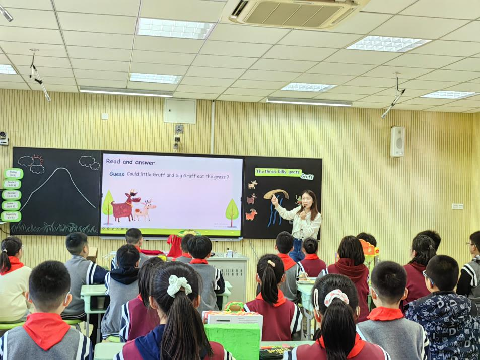 首先,由祁琴花优秀教师培育室成员徐敏华老师向大家展示了一节精彩纷呈的绘本阅读课。徐老师通过创设相关情境,带领学生从唱、看、猜、学、编、演等方式入手,结合美术、劳动、信息技术、语文等学科知识围绕故事《The three billy goats》展开阅读活动。学生在用课前准备的Puppet theater作品灵动地演绎故事,并感受阅读的快乐,从而体会智慧和勇气可以战胜一切。