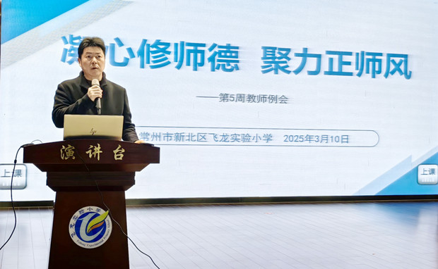 为深入贯彻落实新时代教师职业行为准则,强化教师队伍思想政治建设,3月10日,飞龙实验小学召开“强师德·正师风”专题工作会议。潘建强校长作《新时代教师专业发展与师德修炼》主题报告,通过“四个强化”工程系统推进师德师风建设,全校教职工参加本次专题学习。