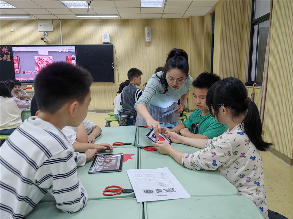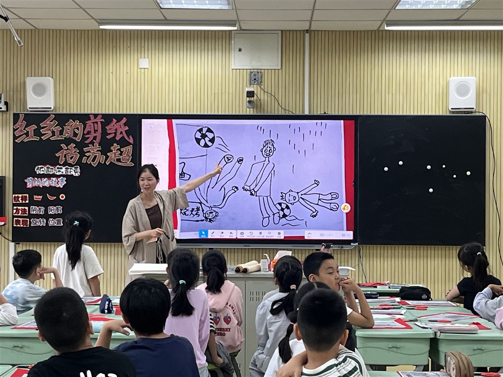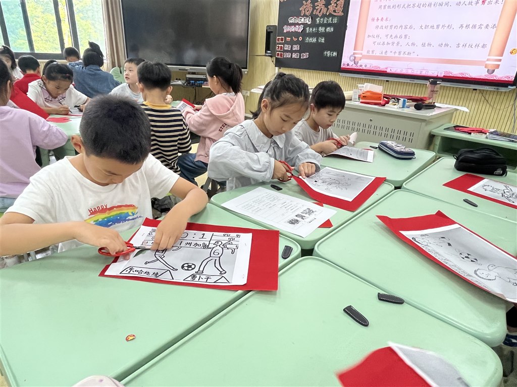 随后,岳聪宴老师带来《剪刀会说话》。她以“苏超”文化中的生活场景为切入点,带领孩子们欣赏“王奶奶的剪纸作品”。课堂中,她以实践操作为核心,结合王奶奶的剪纸案例,拆解剪纸基础方法;重点引导学生观察作品中夸张、概括的表现手法,比如将人物动作放大、简化场景元素;同时通过“千剪不断”的剪纸示范,让学生在动手尝试中掌握连贯剪刻的技巧,切实体会剪纸艺术的独特魅力。