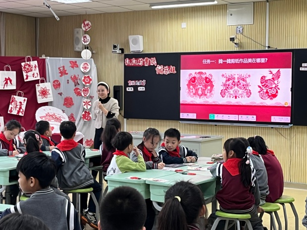 张洲、岳聪宴两位教师围绕《红红的剪纸》单元,带来各具特色的教学实践展示。《剪纸的故事》——以趣启智,联结传统与本土。张洲老师执教第一课时《剪纸的故事》,课堂上以“课前折页学习单”“Ipad云上展馆”搭建多元学习支架,通过“剪纸历史快问快答”“纹样设计小游戏”等趣味形式,引导学生轻松掌握阴剪、阳剪等基础技法。同时创新性融入“苏超”元素,让学生在剪刻实践中感受传统剪纸艺术与本土文化的深度联结。