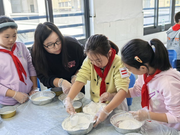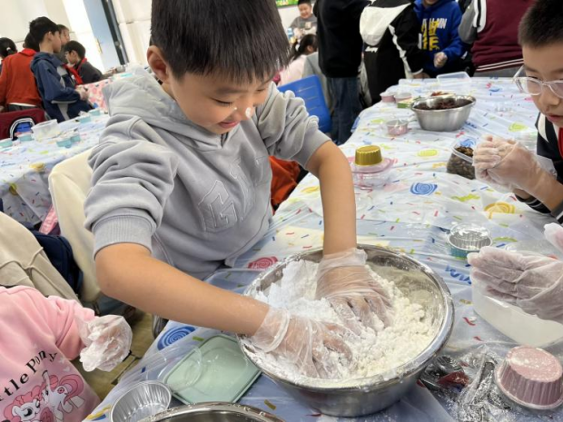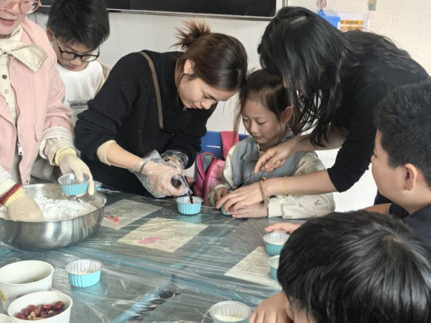 文化知识的熏陶之后,活动进入了最令人期待的环节——亲手制作重阳糕。在家长志愿者和老师们的耐心指导下,孩子们以小组为单位,化身为“小小面点师”。揉面、搓粉、压模、点缀……每一步都做得有模有样。家长们手把手地传授技巧,孩子们则专注地模仿、创造,彼此协作,互相帮助。教室里弥漫着米粉和红枣、葡萄干的香甜气息,欢声笑语与忙碌的身影交织成一幅温馨动人的画面。