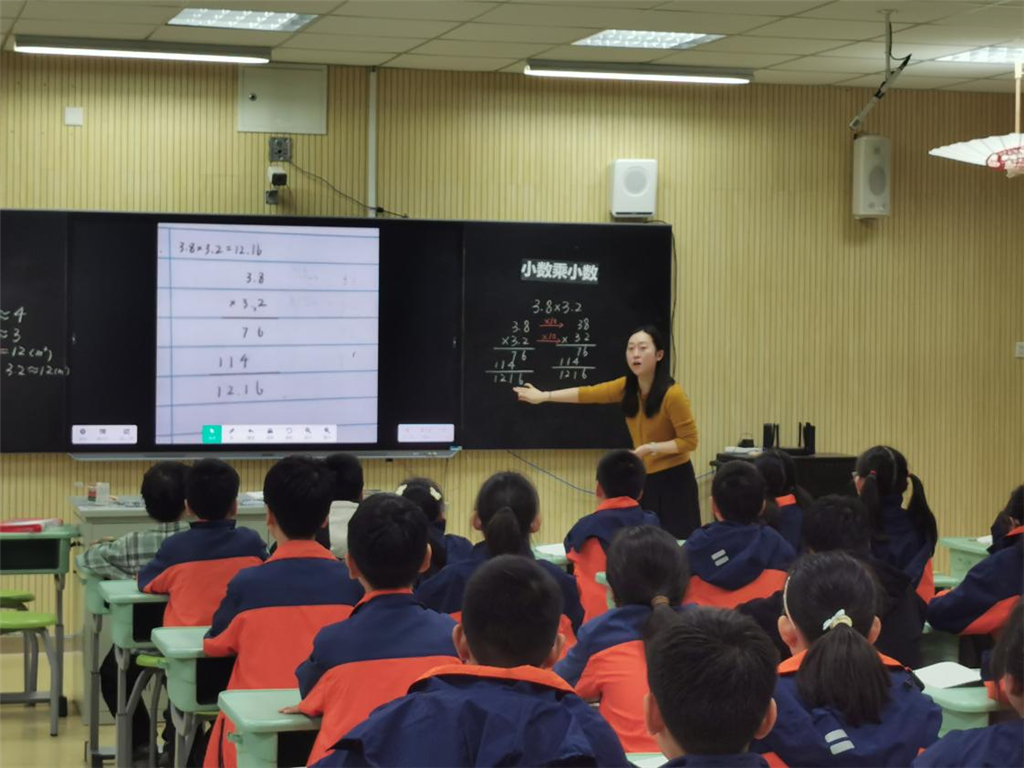 第二节课是由王炜婷老师带来《小数乘小数》的。王老师依托新教材,以“四生课堂”“生本”为导向设计教学:从“整数乘整数复习”自然过渡到“小数乘小数探究”,通过“估一估积的范围”“算一算转化过程”“验一验结果正确性”的递进式任务,引导学生“先猜想再验证”;在推导“积的小数位数确定”时,不直接灌输方法,而是鼓励学生自主尝试、小组讨论,充分体现“四生课堂”中“生成”的价值,助力学生从具体运算向抽象思维平稳过渡。