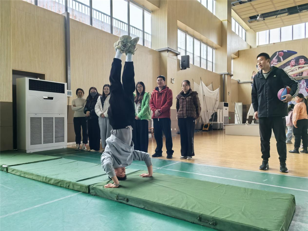 活动前期,体育组明确了本次教研的核心目标与训练要求,提前部署相关准备工作,通知全体教师备好轻便训练服装准时参训,确保教研活动扎实落地、取得实效。活动伊始,主讲人张梁老师与徐骏主任结合中小学体育教学大纲要求,围绕体操基础动作的技术要领、核心发力逻辑、课堂安全防护规范,以及日常教学中学生易错动作的纠正方法等核心内容,进行了系统讲解与标准示范。针对头手倒立等体操核心基本功动作,两位主讲老师从预备姿势、核心控制、动作定型到安全落地全流程,进行了分步拆解与细节讲解,让全体教师清晰掌握动作的规范标准与教学实施重难点。