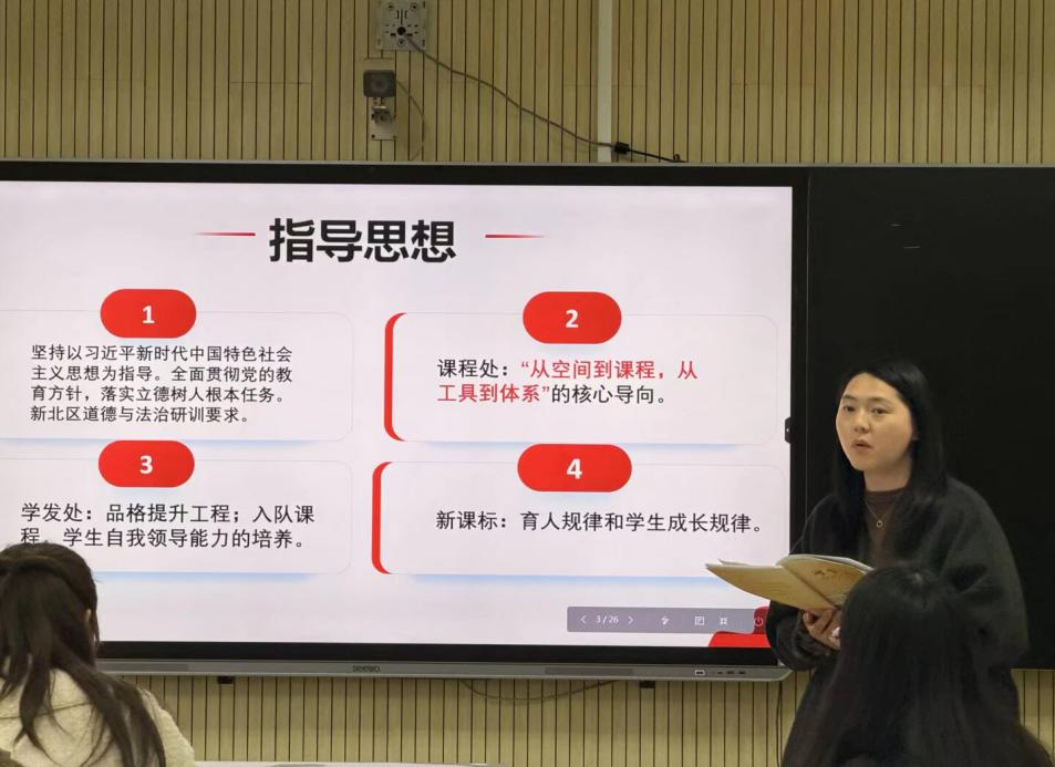 活动最后,新北区小学德法教研员王瑛对本学期学科重点工作进行部署。她结合本次活动主题,明确了新学期新教材落地、教研组建设、教学研讨、教师培训等核心任务。提出了备课要求三个关键词,造境-沉浸、聚焦-对焦、道理道路,教研组建设四字诀:定、真、共、融。作为区道德与法治学科领头人,王老师对如何上好一堂高质量道德与法治课,如何创建好一支高质量道德与法治教师队伍,给老师们提供了清晰的实践路径。
