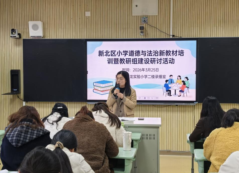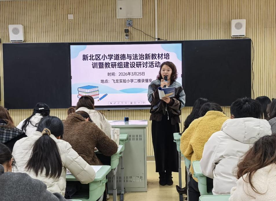 春潮涌动启新程,教研赋能促成长。为全面贯彻落实党和国家的教育方针,充分发挥思政课程立德树人、培根铸魂的核心作用,引导教师深化对新课标、新教材的理解与把握,加强“五新”研究,提升课程建设与教学实施能力,促进道德与法治学科教师队伍专业成长,2026年3月25日下午,新北区小学道德与法治新教材培训暨教研组建设研讨活动(第一场)在飞龙实验小学顺利开展。全区各校教研组长、三年级道德与法治教师或骨干教师及薪火成长营全体成员齐聚一堂,共赴这场以研促教、以学赋能的思政教研盛宴。